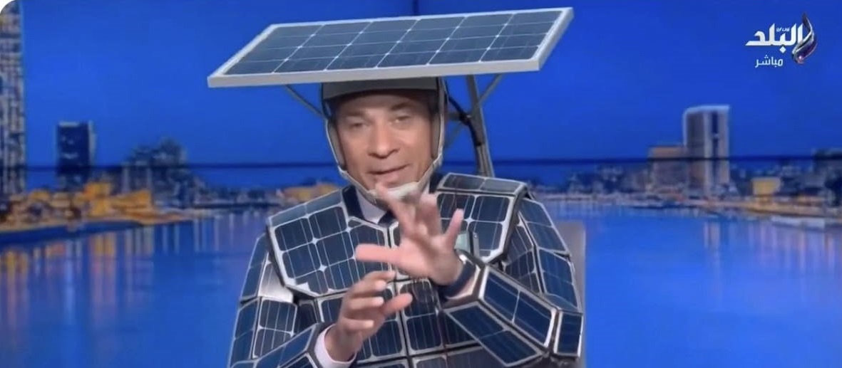 ظهر في الفيديو “غير الحقيقي المصنوع بالذكاء الاصطناعي” الإعلامي أحمد موسى يرتدي بدلة على طاقة شمسية.