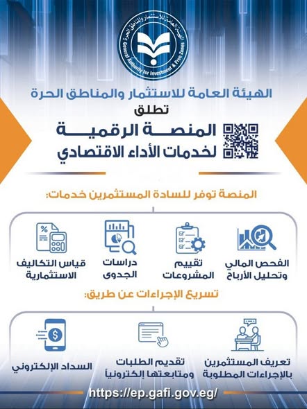 ويمكن للمستثمرين التقدم للحصول على الخدمات من خلال الرابط: https://ep.gafi.gov.eg، أو عبر مسح رمز الاستجابة السريعة (QR Code).