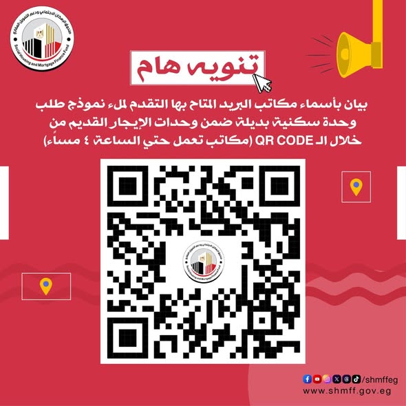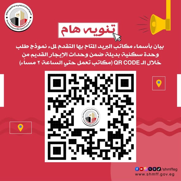 وأضافت مي عبد الحميد، الرئيس التنفيذي لصندوق الإسكان الاجتماعي ودعم التمويل العقاري، أن بعض مكاتب البريد سوف يستمر العمل بها من ٩ صباحًا حتى ٢ ظهرًا، ويمكن التعرف عليها من خلال الرابط https://bit.ly/4qAFiWV، بينما يستمر العمل في بعض المكاتب الأخرى من ٩ صباحًا حتى ٤ عصرًا، ويمكن التعرف عليها عبر الرابط https://bit.ly/4qEM4eg، مضيفة أنه تم تخصيص موظفين بكل مكتب بريد عبر منافذ مخصصة لذلك؛ لمساعدة المواطنين في استيفاء نموذج الطلب الإلكتروني.