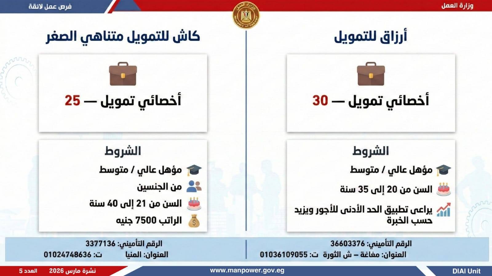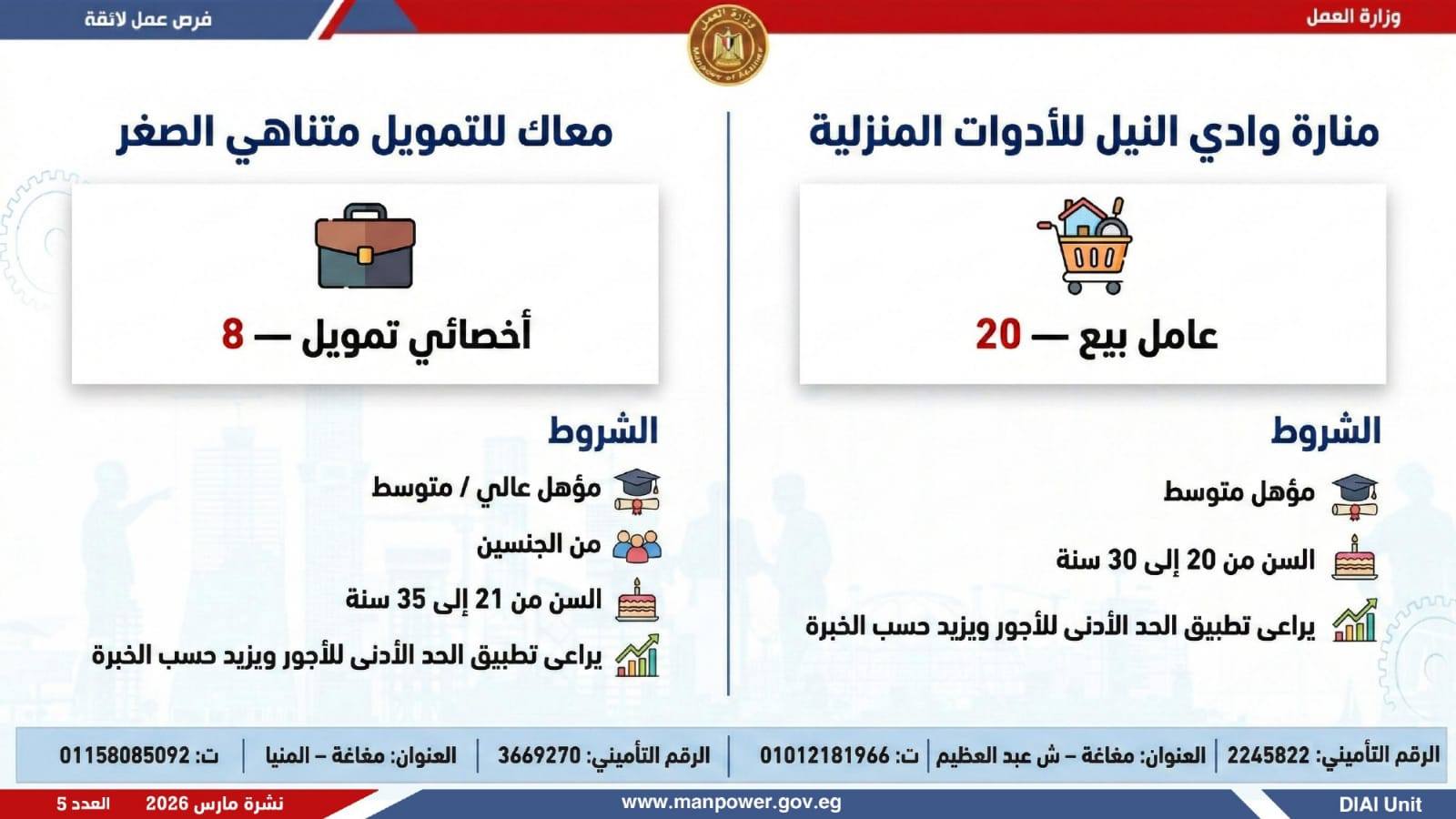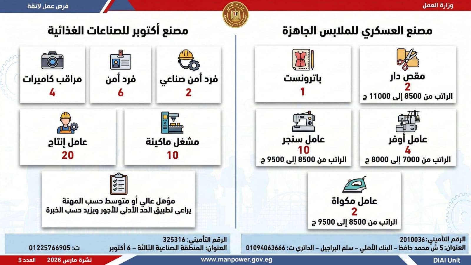 وفي بعدٍ رقابي، وجّه الوزير مديريات العمل بالمحافظات بتكثيف المتابعة الميدانية لضمان جدية الفرص المعلنة، والتأكد من التزام المنشآت بتطبيق الحد الأدنى للأجور، وتحري الدقة والمصداقية في نشر الوظائف، حتى استلام العامل لمهام عمله رسميًا، كما جدّد دعوته لشباب مصر للإقبال على العمل بالقطاع الخاص، مؤكدًا أن الدولة توفر برامج تدريب مهني مجانية تؤهل الشباب لوظائف المستقبل وفق احتياجات سوق العمل…وبيّنت الوزارة أن التقديم يتم عبر الإدارة العامة للتشغيل بمقر الوزارة القديم بمدينة نصر، أو من خلال مديريات العمل بالمحافظات، أو مباشرة عبر بيانات الشركات المرفقة بالنشرة، وكذلك من خلال الموقع الرسمي للوزارة، مشيرة إلى أن نشرة التوظيف تصدر بشكل نصف شهري، من خلال الإدارة العامة للتشغيل برئاسة هبة أحمد، وبإعداد منى شوقي – باحث أول بالإدارة، وتتضمن أحدث الفرص المتوفرة على مستوى الجمهورية، نتاج تعاون مشترك بين مديريات العمل والقطاع الخاص بالمحافظات.