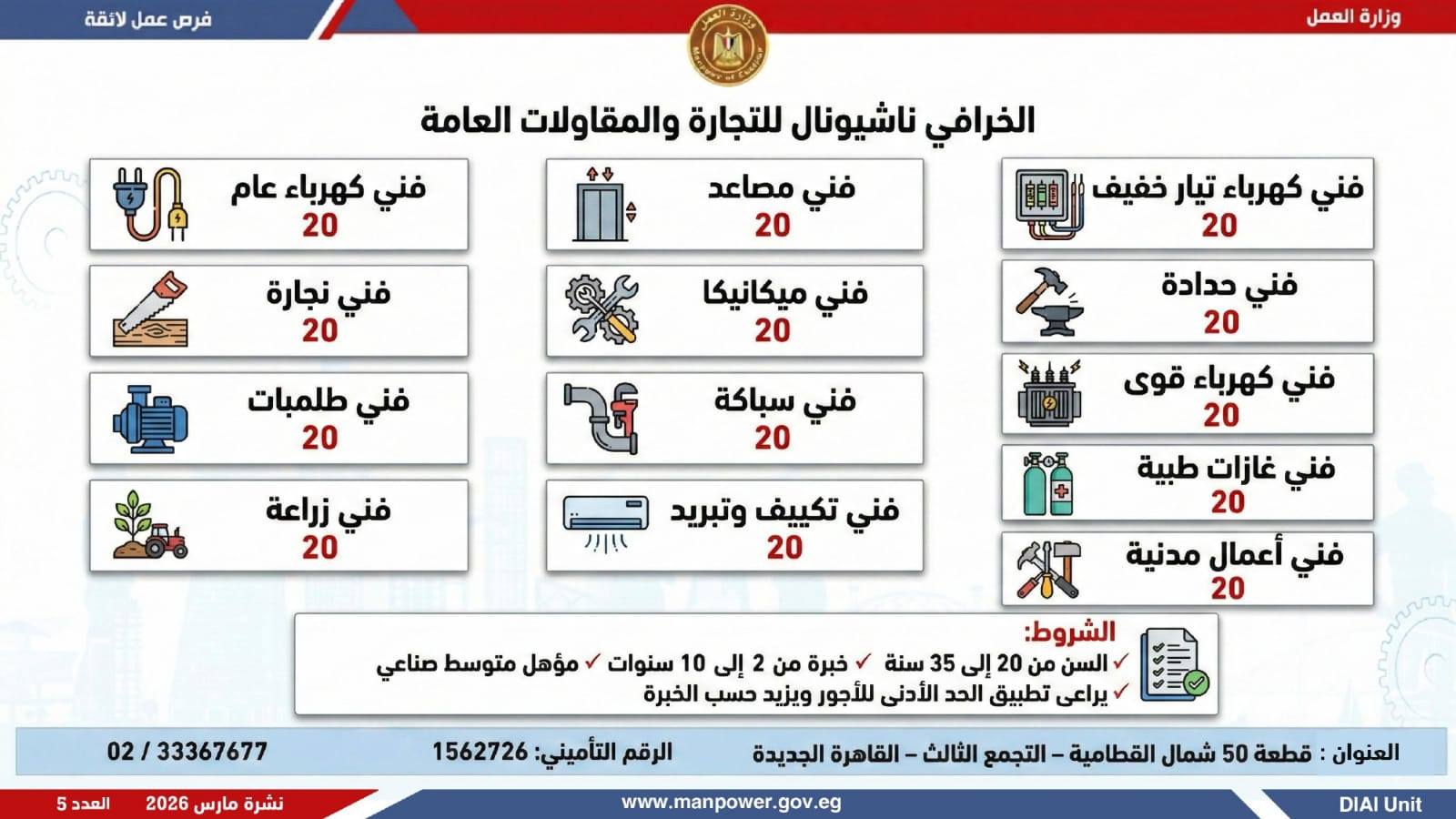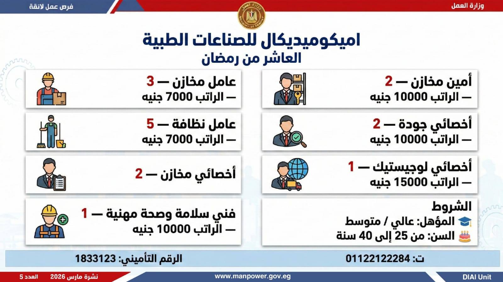 وبيّنت الوزارة أن النشرة تضم فرصًا متنوعة في عشرات التخصصات والمهن، برواتب مجزية تُحدد وفق طبيعة الوظيفة والمقابلة الشخصية، مع التزام كامل بتطبيق الحد الأدنى للأجور، والاستفادة من مظلة التأمينات الاجتماعية والصحية، بما يضمن بيئة عمل آمنة ومستقرة تحفظ كرامة العامل وتصون حقوقه، كما تشمل النشرة فرصًا مخصصة لذوي الهمم في إطار سياسة الدمج المجتمعي والتمكين الاقتصادي الحقيقي…وتغطي الفرص الجديدة محافظات:القاهرة، الجيزة، القليوبية، الإسكندرية، المنيا، سوهاج، المنوفية، دمياط، أسوان، السويس، الشرقية..وفي تخصصات متعددة تشمل: التسويق والموارد البشرية، الهندسة (اتصالات وكهرباء)، الميكانيكا والتحكم الكهربائي، الصيانة، المحاسبة، الإشراف الفني والموقعي، الإنتاج، المشتريات، المبيعات، الجودة، الأمن، المخازن، القيادة برخص مختلفة، الفندقة والمطاعم، إلى جانب أعمال الإنتاج والنظافة وتخصصات أخرى متنوعة.